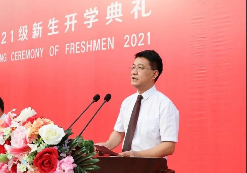 全体师生员工向2021级新生表示衷心的祝贺和热烈的欢迎。他寄语新同学们要强志气,立鸿鹄伟志,做有理想、有追求的大学生;要强骨气,炼钢筋铁骨,做有担当、有作为的大学生;要强底气,增学识见闻,做有内涵、有修养的大学生。希望同学们牢记习近平总书记的嘱托,握紧四载春华,高扬理想风帆,坚定信念、锤炼品格、练就本领,以真才实学奋进新征程、建功新时代。