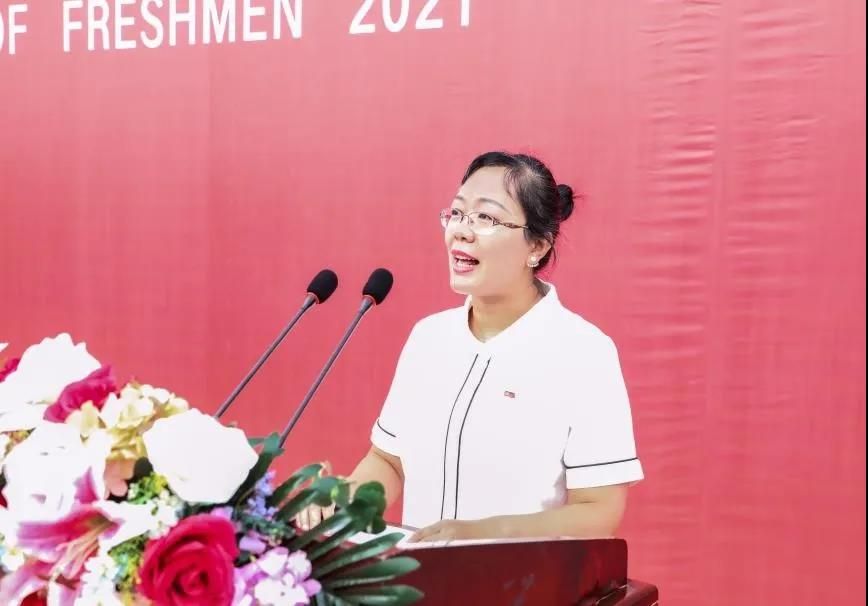 杨婷亦同学代表2021级新生发言,她号召全体新同学要把握大学四年时光,找准“小目标”,做好“大规划”,树立远大的理想信念,勇担时代重任,秉承“明德励学、效实致新”的校训精神,奋斗青春,报效祖国!